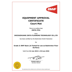 INTA JT01 badminton kort matı, Badminton World Federation (BWF) tarafından Grade 3: Basic (A-Tested) standardında resmi olarak onaylanmıştır. 01 Temmuz 2024 – 30 Haziran 2026 tarihleri arasında geçerli olan bu sertifika, ürünün uluslararası badminton standartlarına uygunluğunu kanıtlar.