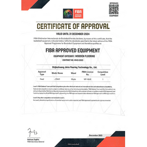 Shijiazhuang Jinta Flooring Technology Co., Ltd. tarafından üretilen ahşap spor zeminleri, Uluslararası Basketbol Federasyonu (FIBA) tarafından en yüksek kalite seviyesi olan 1. Seviye Onay ile sertifikalandırılmıştır. Bu belge, zeminlerimizin uluslararası müsabakalar için uygunluğunu ve üstün performans standartlarını resmi olarak doğrulamaktadır.